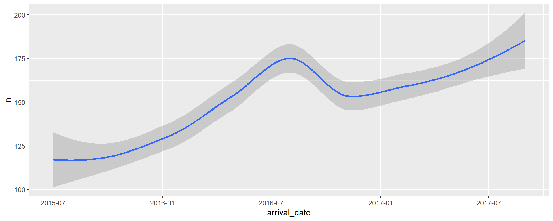 ggplot(aes(x = arrival_date, y = n, group = 1)) +