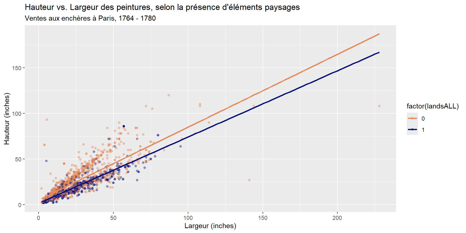Coefficient (\(\beta_1 = -5.645\)): Différence moyenne de hauteur entre les peintures avec éléments de paysages et celles sans. Les peintures avec éléments de paysages sont en moyenne 5.645 pouces plus courtes que celles sans.