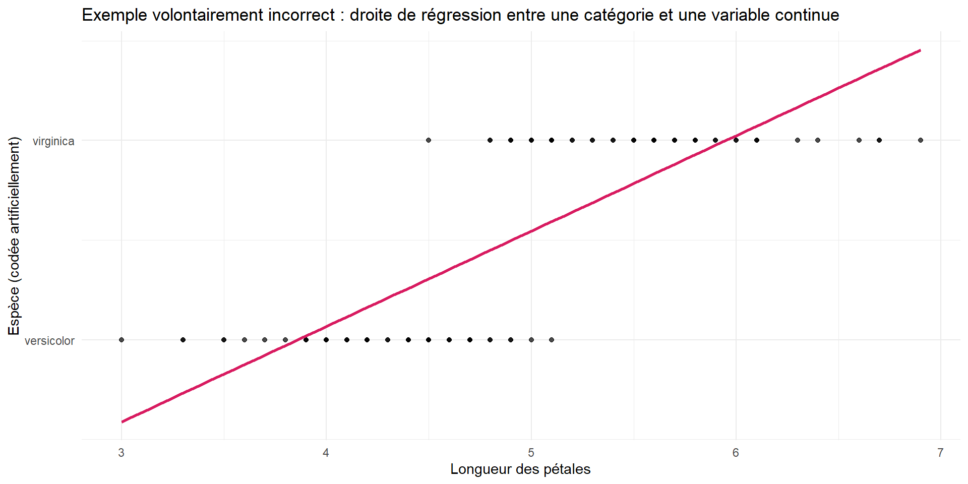 title = "Exemple volontairement incorrect : droite de régression entre une catégorie et une variable continue",