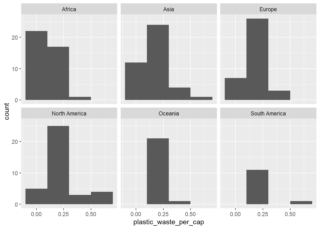 À l’aide d’un histogramme, affichez la distribution des quantité de déchets par habitant, en ajoutant une facette par continent. Que pouvez-vous dire de la comparaison des continents, en terme de déchets plastiques ?