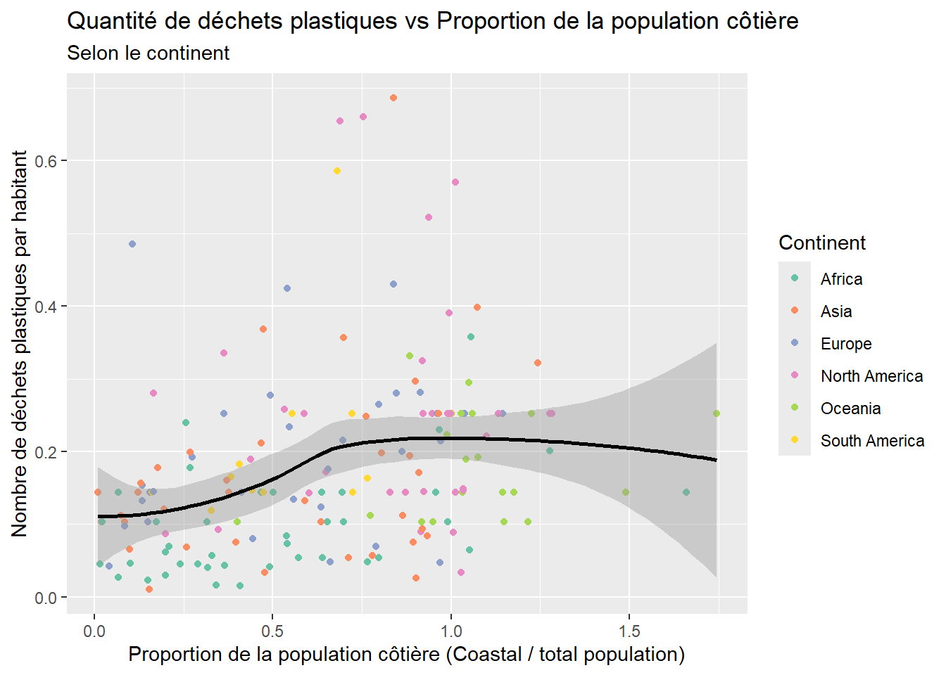 filter(plastic_waste_per_cap < 3)Nous avons calculé une nouvelle variable, la proportion de population côtière, appelée coastal_pop_prop, à partir du nombre d’habitants vivant sur une côte et du nombre d’habitants total. Nous avons également fitré le pays avec une quantité de déchets par habitant supérieure à 3 kg/jour.