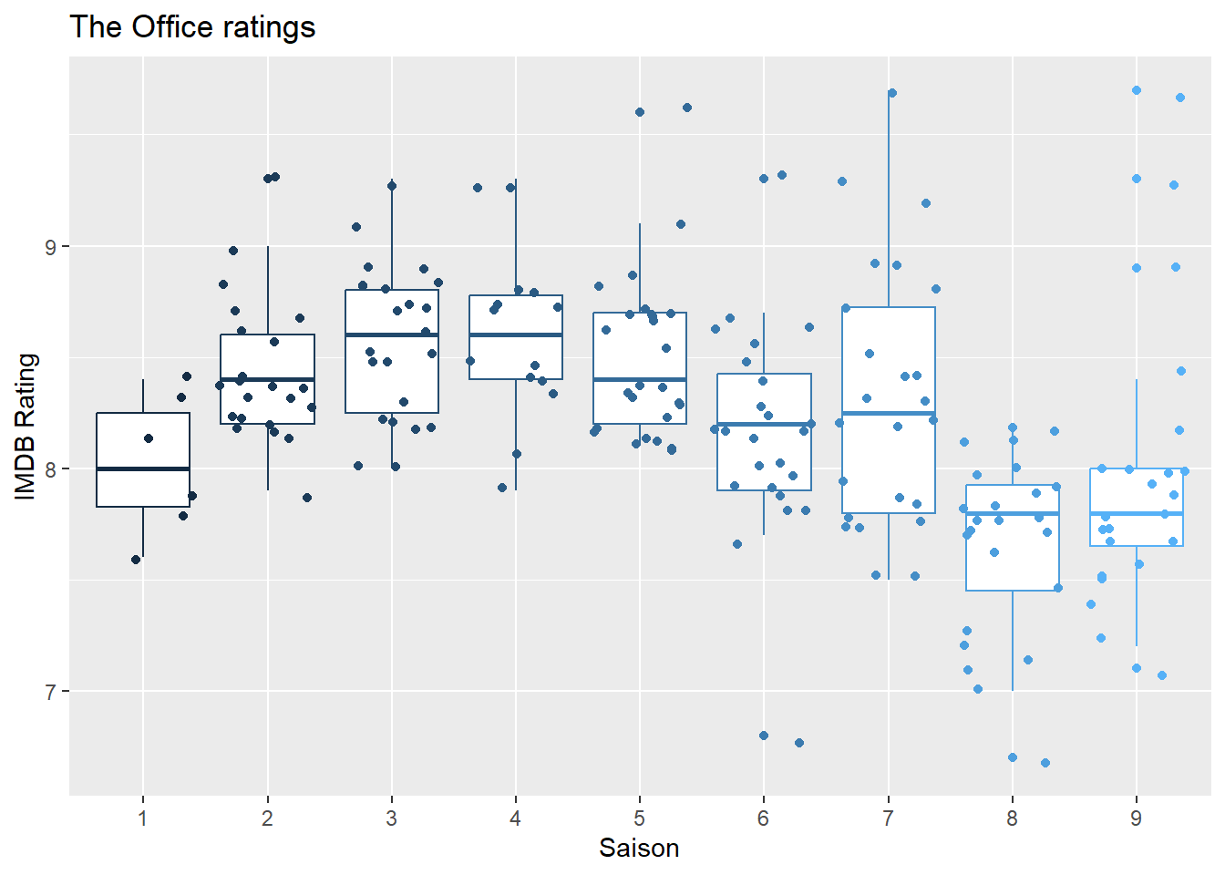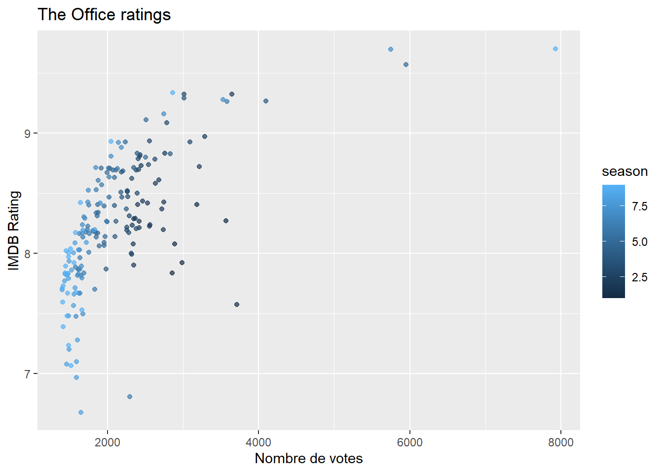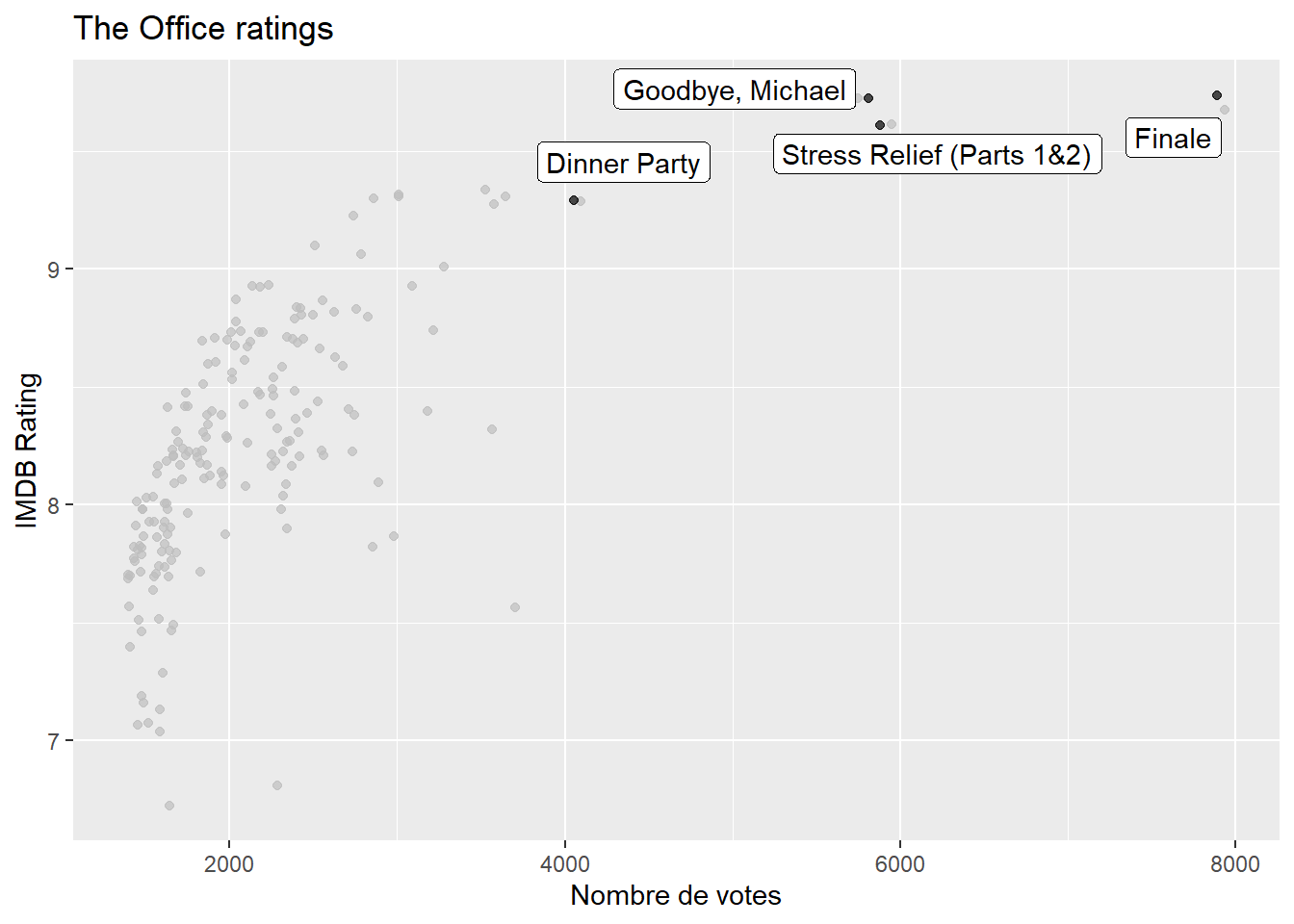 install.packages("schrute")Il est ensuite possible de charger le jeu de données avec la commande :
