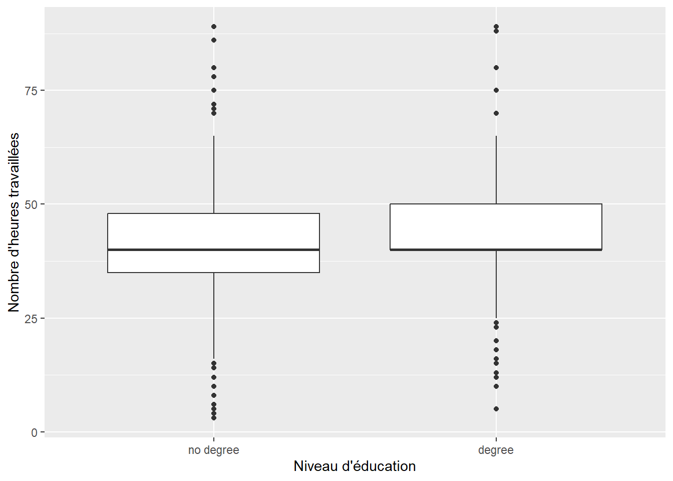 Nous allons commencer par un test d’hypothèses sur une variable numérique. Supposons que nous voulons tester si le temps de travail hebdomadaire est égal à 40 heures en moyenne. Pour cela, nous allons effectuer un test d’hypothèses.