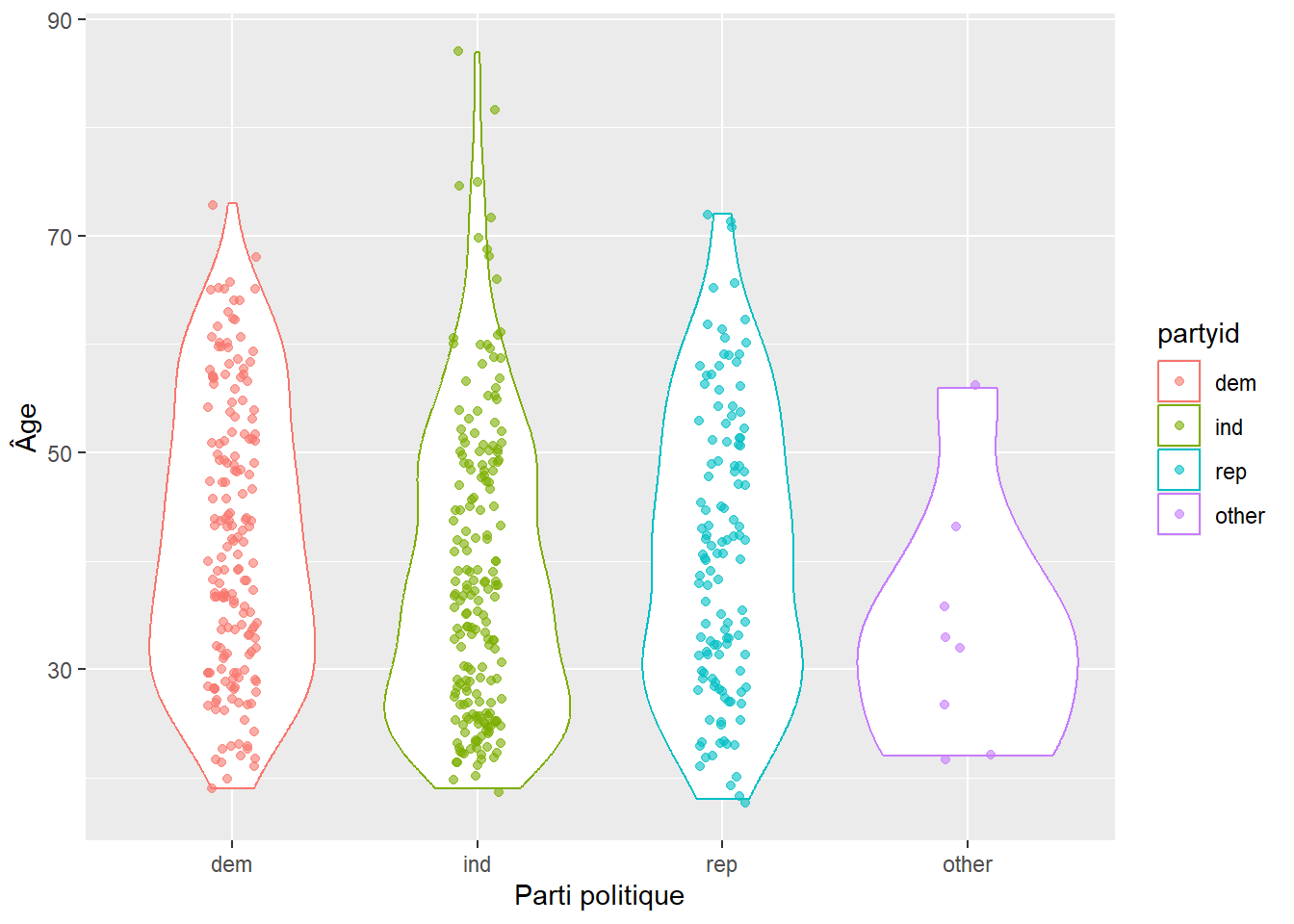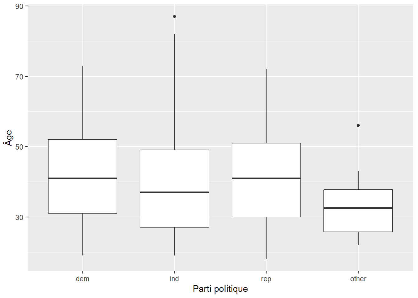 Pour comparer une valeur entre plusieurs groupes, nous pouvons faire un test d’hypothèses ANOVA. Supposons que nous voulons tester s’il y a une différence dans l’âge des participants en fonction de leur affiliation à un parti politique.