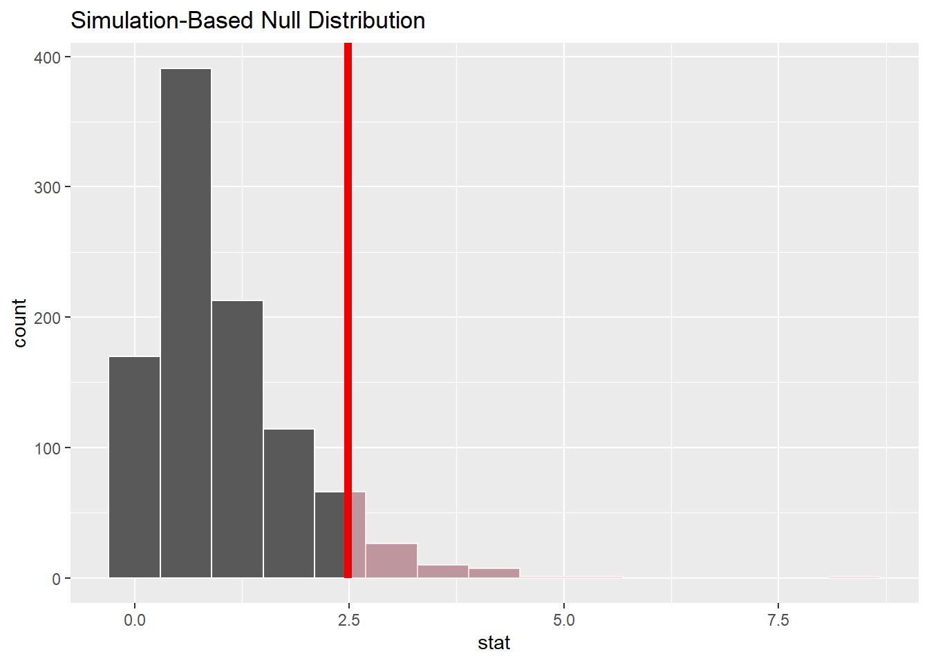 shade_p_value(obs_stat = observed_f_statistic, direction = "greater")