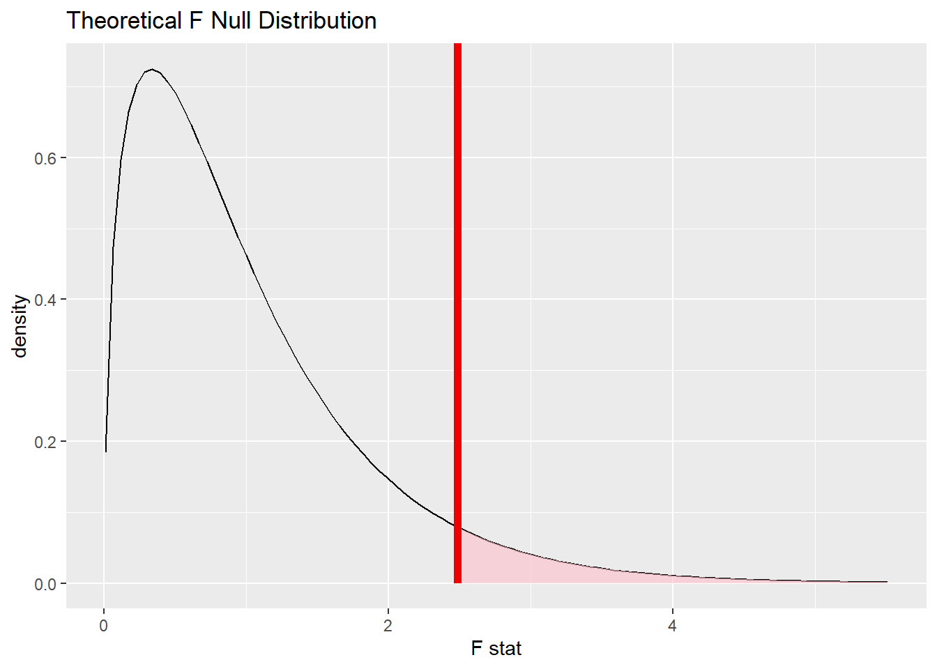 Jusqu’ici, nous avons utilisé des méthodes de rééchantillonnage pour générer des distributions nulles. Cependant, pour certains tests statistiques, il existe des modèles théoriques qui décrivent la distribution nulle. Par exemple, dans le cas du test ANOVA, la statistique F suit une distribution F sous l’hypothèse nulle. Nous pouvons utiliser cette information pour calculer la p-value sans avoir à générer une distribution nulle.