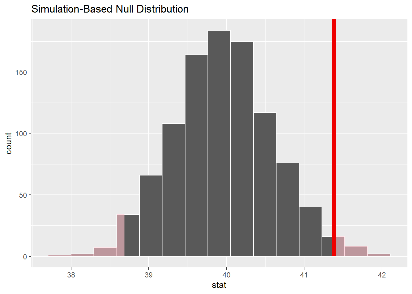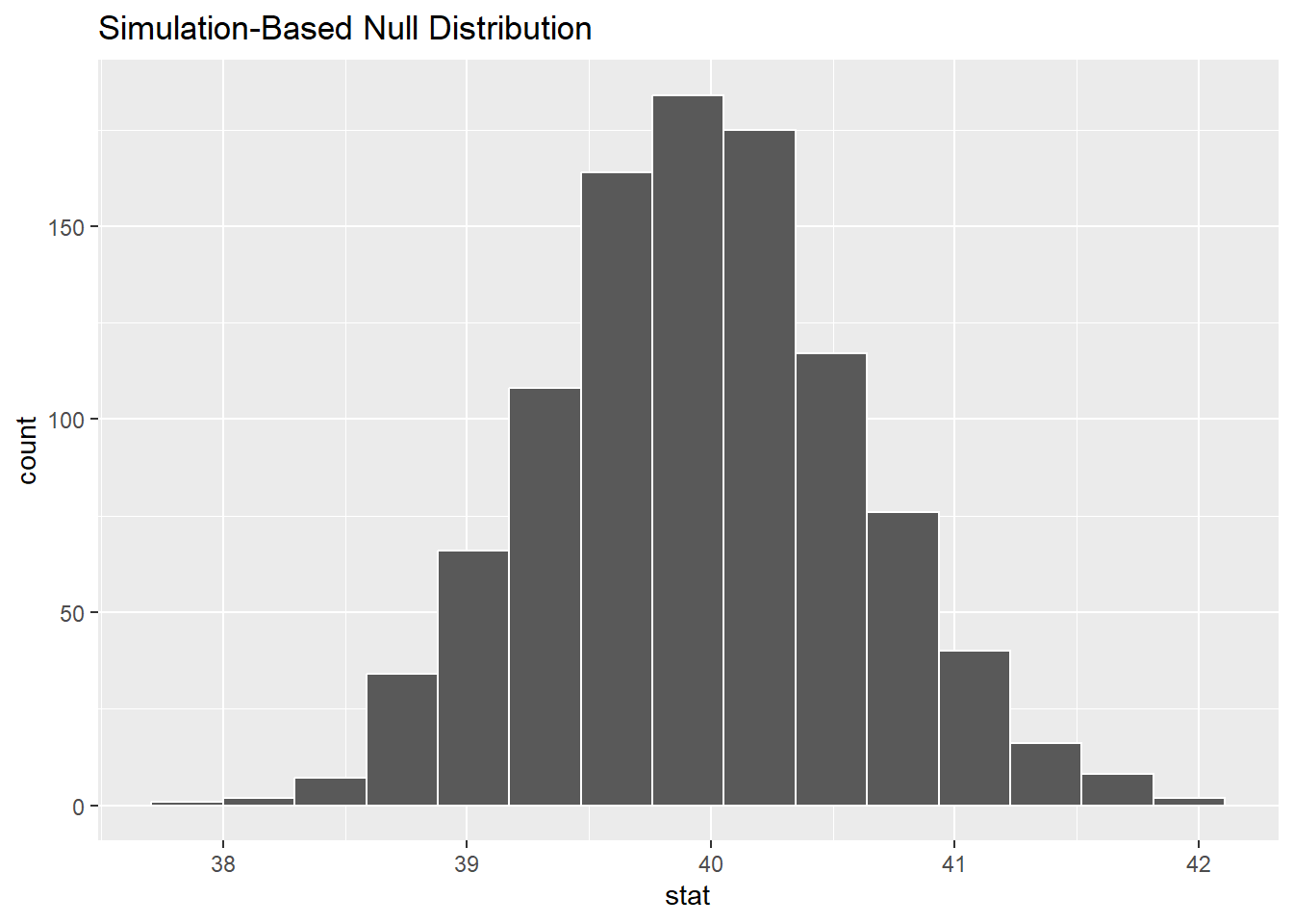 hypothesize(null = "point", mu = 40)Response: hours (numeric)
